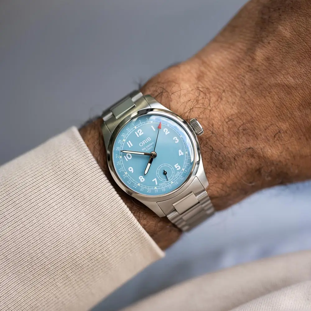 The Oris Big Crown Calibre 473 builds on the brand’s iconic pilot watch heritage, combining classic design with modern mechanical performance. The stainless steel case measures 38 mm, offering balanced proportions and comfortable wear, with 50 m water resistance. The clear dial features large Arabic numerals, a signature pointer date function, and a small seconds subdial at 6 o’clock, preserving the authentic pilot style.