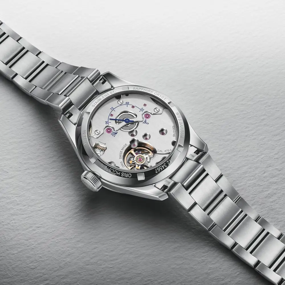 At its core is the in-house Oris Calibre 473, a manual-winding movement with an extended 120-hour (5-day) power reserve. It operates at 28,800 vph (4 Hz) and includes a power reserve indicator on the caseback. The movement is designed for durability and low maintenance, supported by a 10-year warranty.