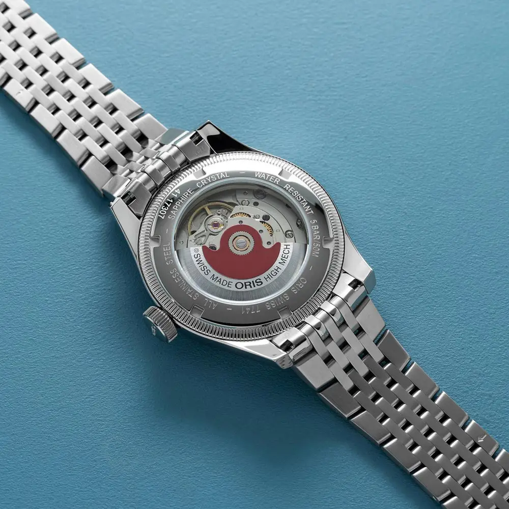 The watch features Oris’ signature Pointer Date function, where a central hand with a red tip points to the date along the outer scale of the dial. Inside ticks the reliable automatic Oris Calibre 754, based on the SW 200-1, offering a power reserve of 38 hours and a hacking seconds function for precise time setting.