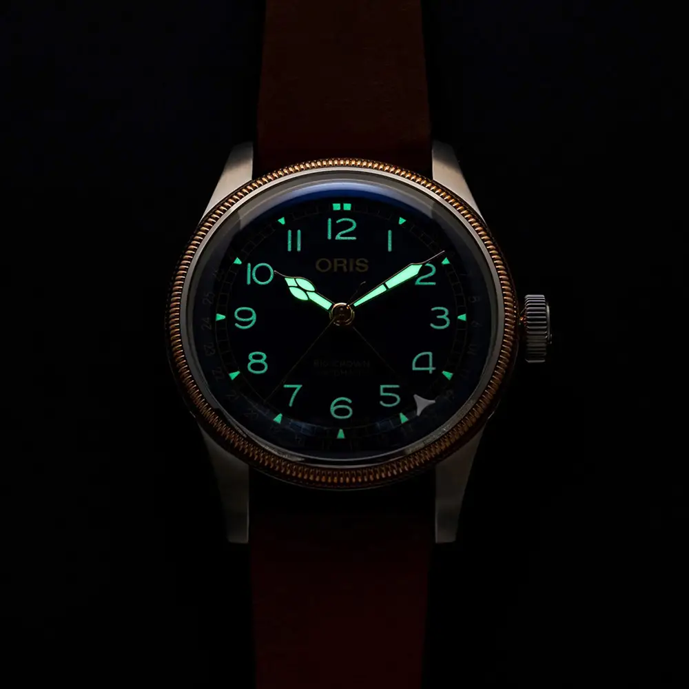 Big Crown watches combine vintage aesthetics with modern technology: rounded sapphire crystal, Arabic numerals, a distinctive minute scale and the typical pointer date function - a hand showing the date around the perimeter of the dial. Models are available in various sizes, with automatic movements, including the in-house calibre Oris 403 with anti-magnetic properties and a 5-day power reserve.