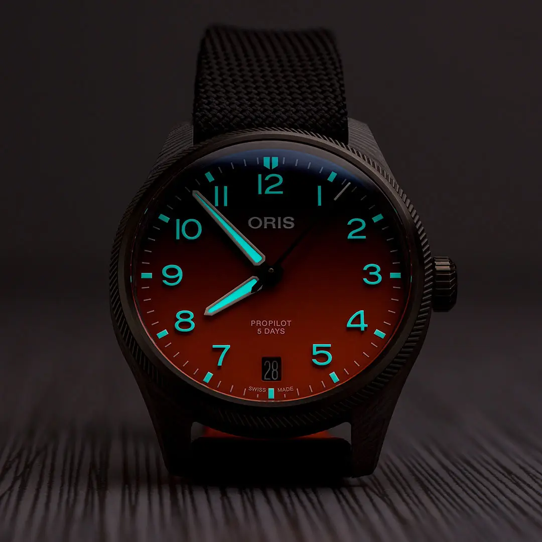 The dial, with its gradient orange-red effect, symbolizes the fire that is a key element of Coulson Aviation's work. The hands and indices are coated with Super-LumiNova®, ensuring perfect legibility even in low-light conditions.