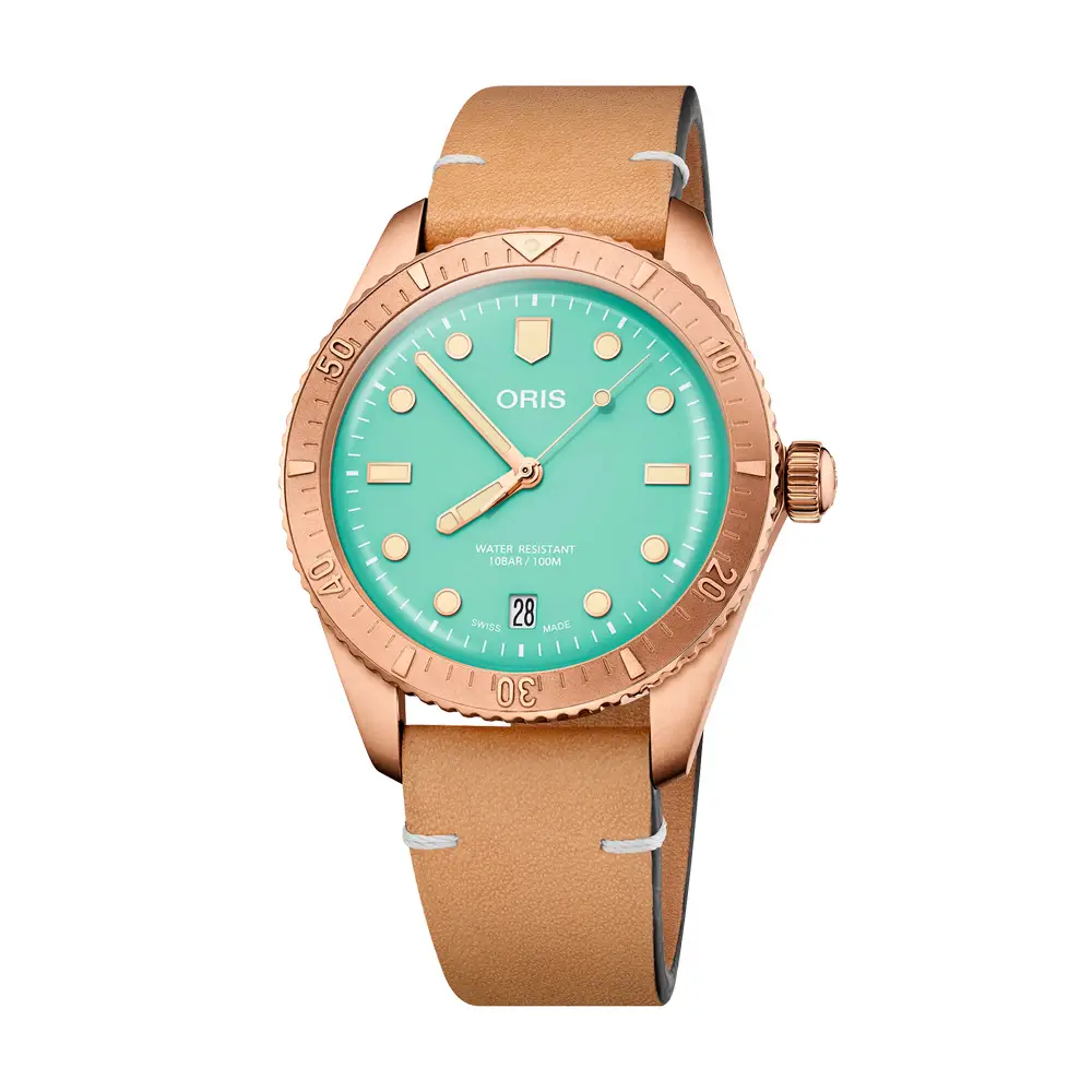 Water-resistant to 100 meters (10 bar) and fitted with a brown leather strap, the Oris Divers Sixty-Five is a tribute to the golden age of diving watches — uniting retro design, modern reliability, and Swiss horological excellence in one timeless creation.