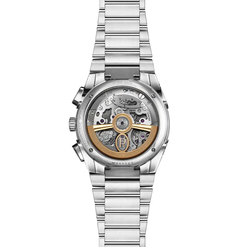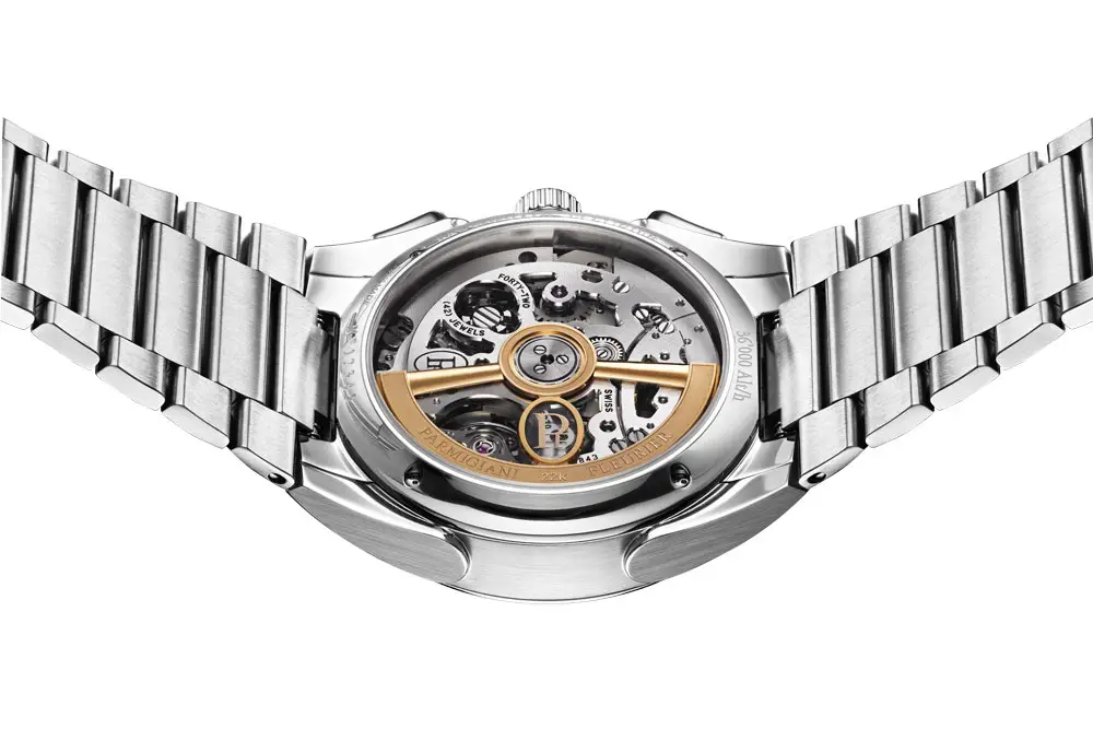 Inside is the in-house automatic calibre PF070, an integrated chronograph with a 5 Hz high-frequency movement (36 000 vph) and COSC certification. It offers a power reserve of 65 hours and features a slim profile (movement thickness of 6.95 mm). The movement is richly decorated, including a skeletonized rotor in 22kt rose gold, and is fully visible through the sapphire crystal.