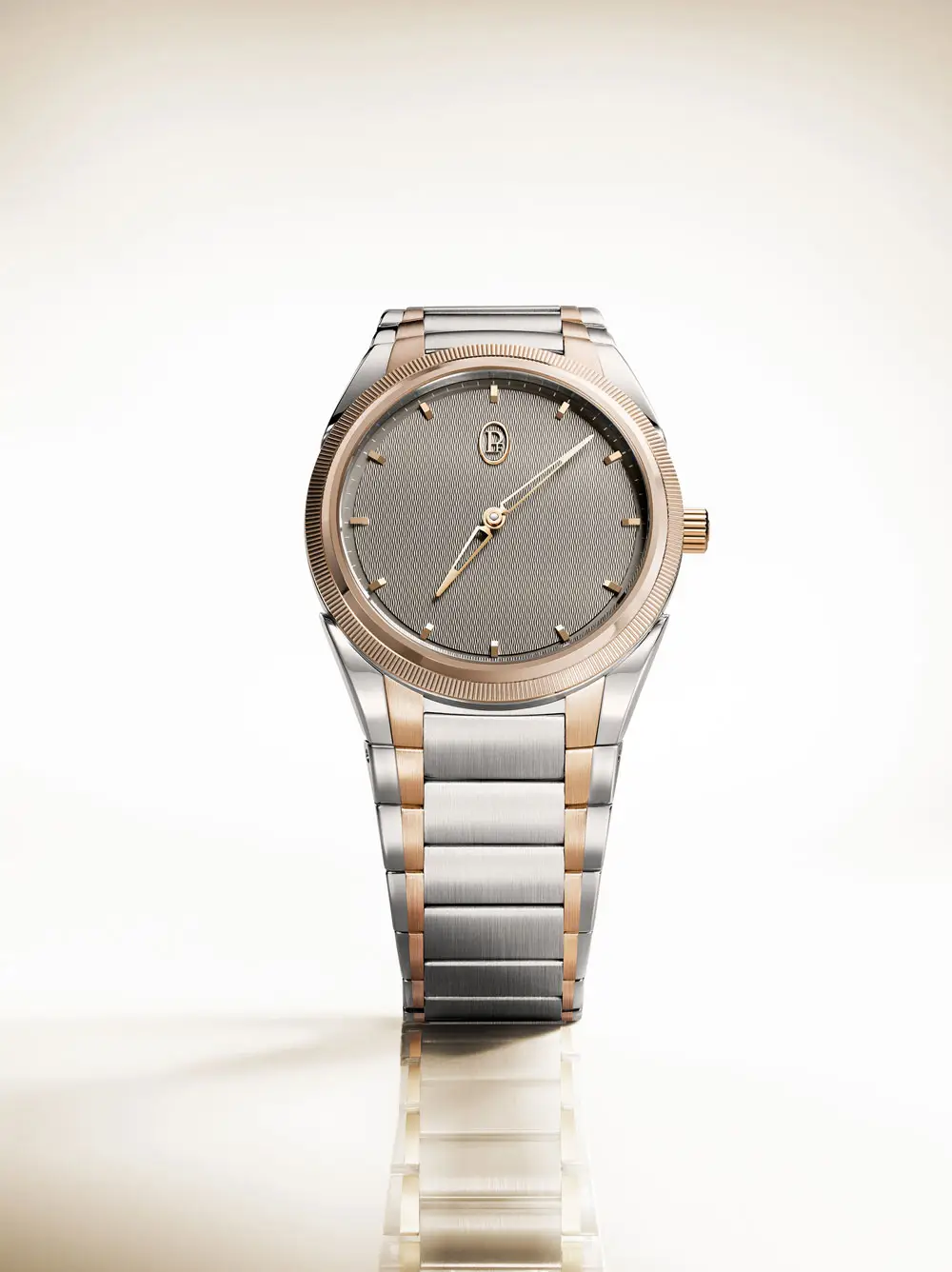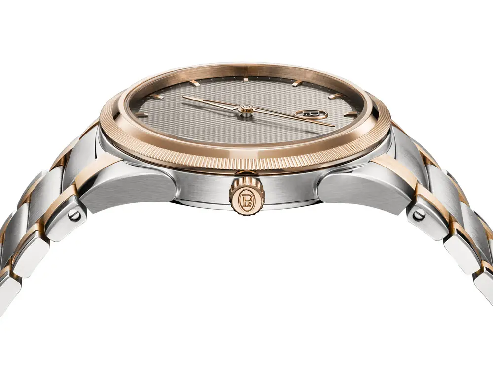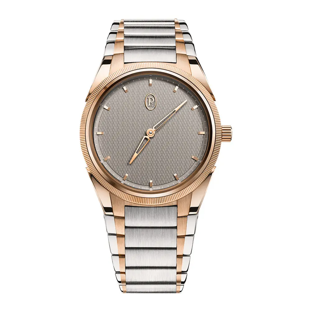 The Parmigiani Tonda PF Automatic 36 mm stands out with its elegant combination of stainless steel and 18kt rose gold, which gives the watch a subtle but distinctive two-tone character. The 36 mm case is complemented by a lunette in rose gold, while the dial in Sand Grey is decorated with a precise hand-engraved guilloché Grain d'Orge pattern. The hands and indexes in 18kt gold create a perfectly harmonious whole.