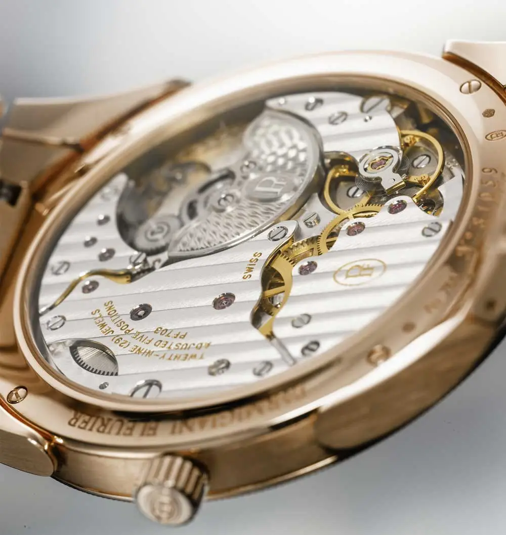Inside the watch beats the ultra-thin automatic calibre PF703 with a micro-rotor in solid platinum, which allows the case to reach a height of just 7.8 mm. This exquisite movement offers a power reserve of 48 hours and its precise decoration is fully visible through the transparent sapphire dial.