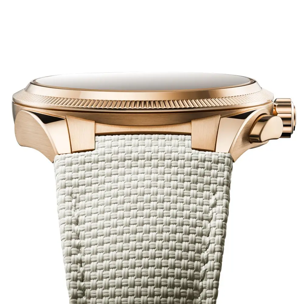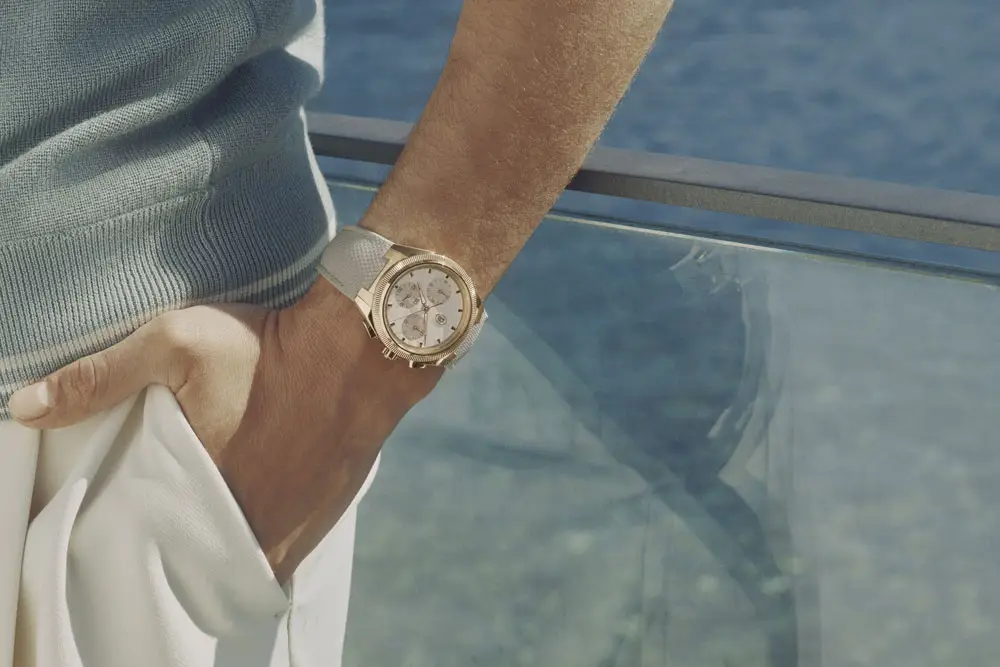 The Parmigiani Fleurier Tonda PF Sport Chronograph in 18-carat rose gold blends athletic elegance with haute horlogerie refinement. Its 42 mm case features a hand-knurled bezel and is paired with a sandstone-colored dial enhanced by tri-compax counters and luminescent Delta hands.