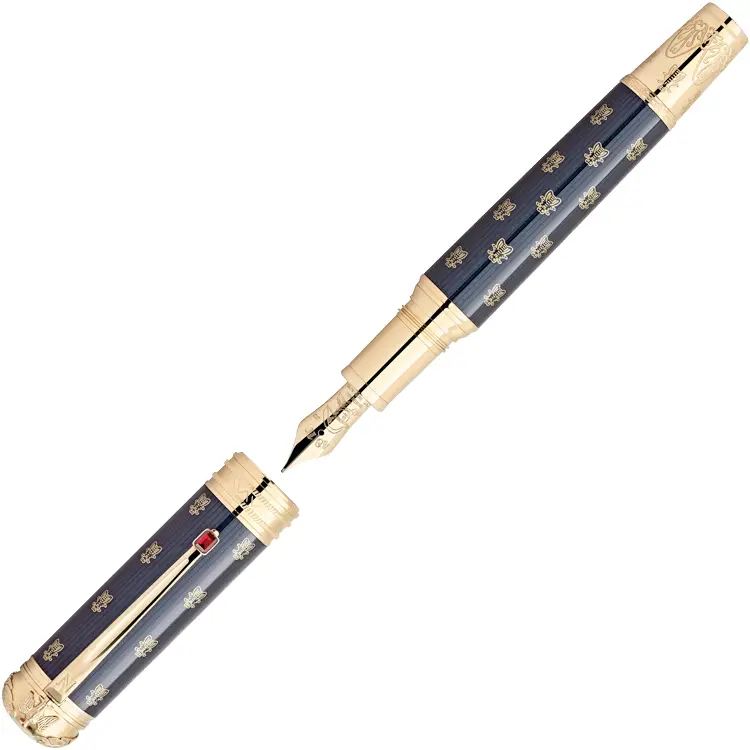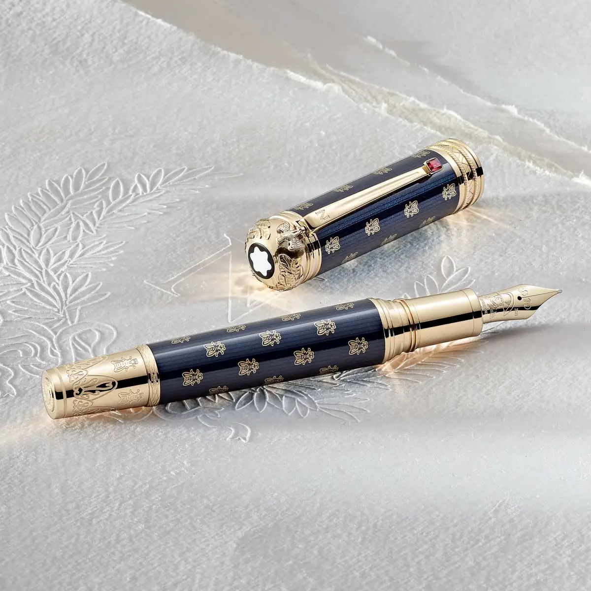 Clip | The gold-plated clip of the pen with the letter N is inspired by the blade of a sword, the red stone refers to the coronation ring of Empress Josephine |