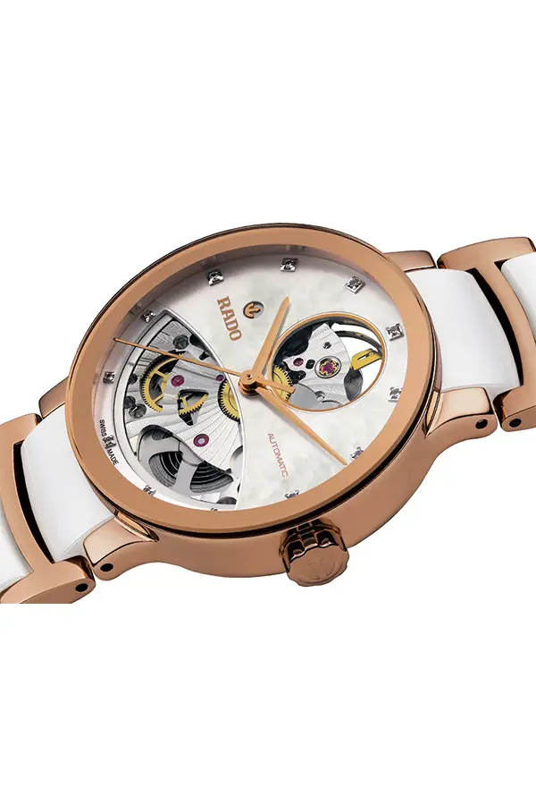 The Rado Centrix Ladies Automatic Open Heart Diamonds R30248902 embodies feminine elegance, technical mastery, and Swiss precision. Its 33 mm stainless steel case with a gold PVD finish flows seamlessly into a bracelet that combines polished steel and high-tech ceramic, creating a perfect harmony of brilliance and refinement. The mother-of-pearl dial is adorned with diamond hour markers and an elegant open-heart aperture that reveals the beating heart of the automatic movement.