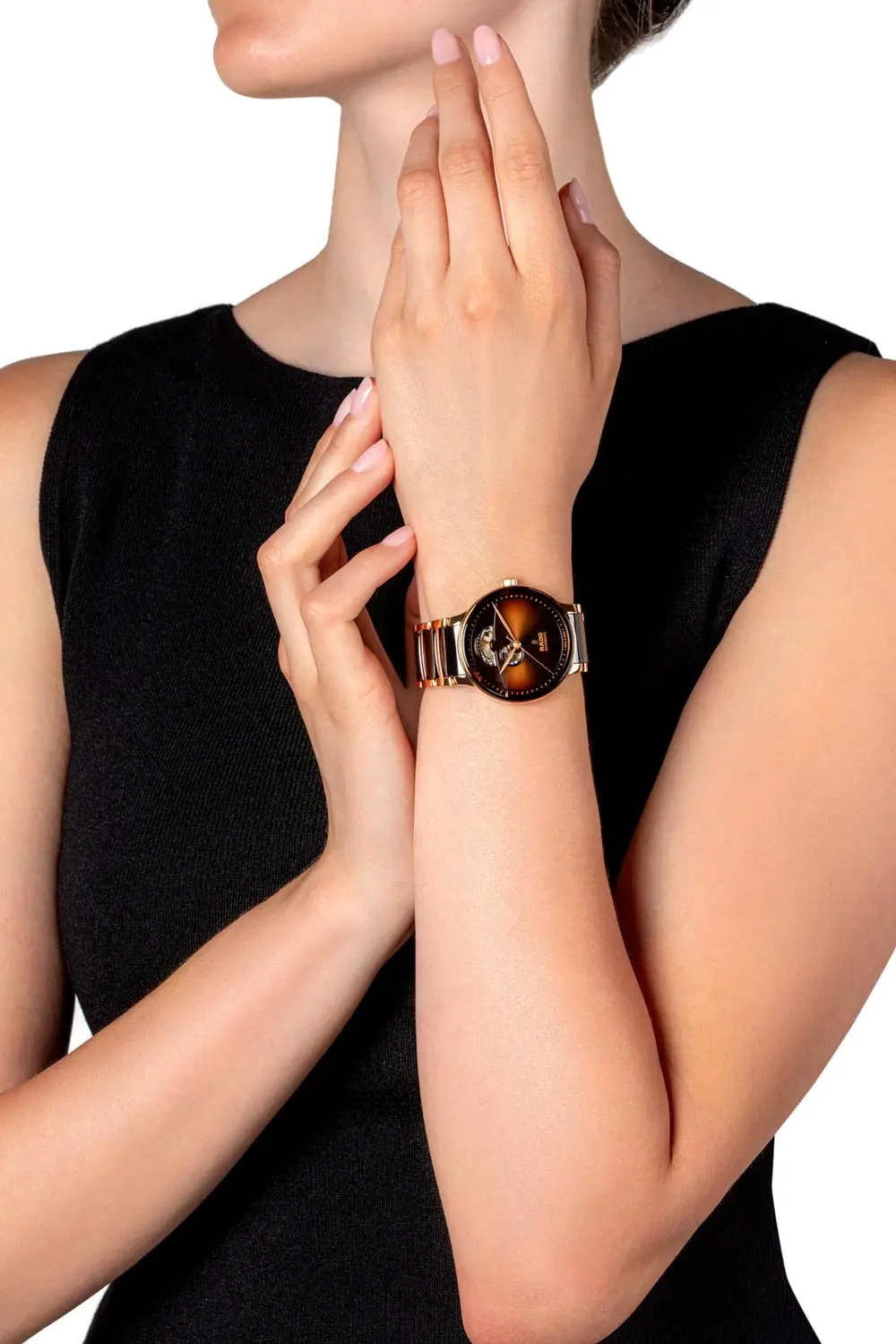The brown dial with an open heart reveals the precision of the automatic mechanical movement with an approximate 80-hour power reserve. It is protected by sapphire crystal, ensuring maximum clarity and durability. The brown bracelet made of a combination of ceramic, stainless steel, and rose gold plating is finished with a folding clasp for secure and comfortable wear.