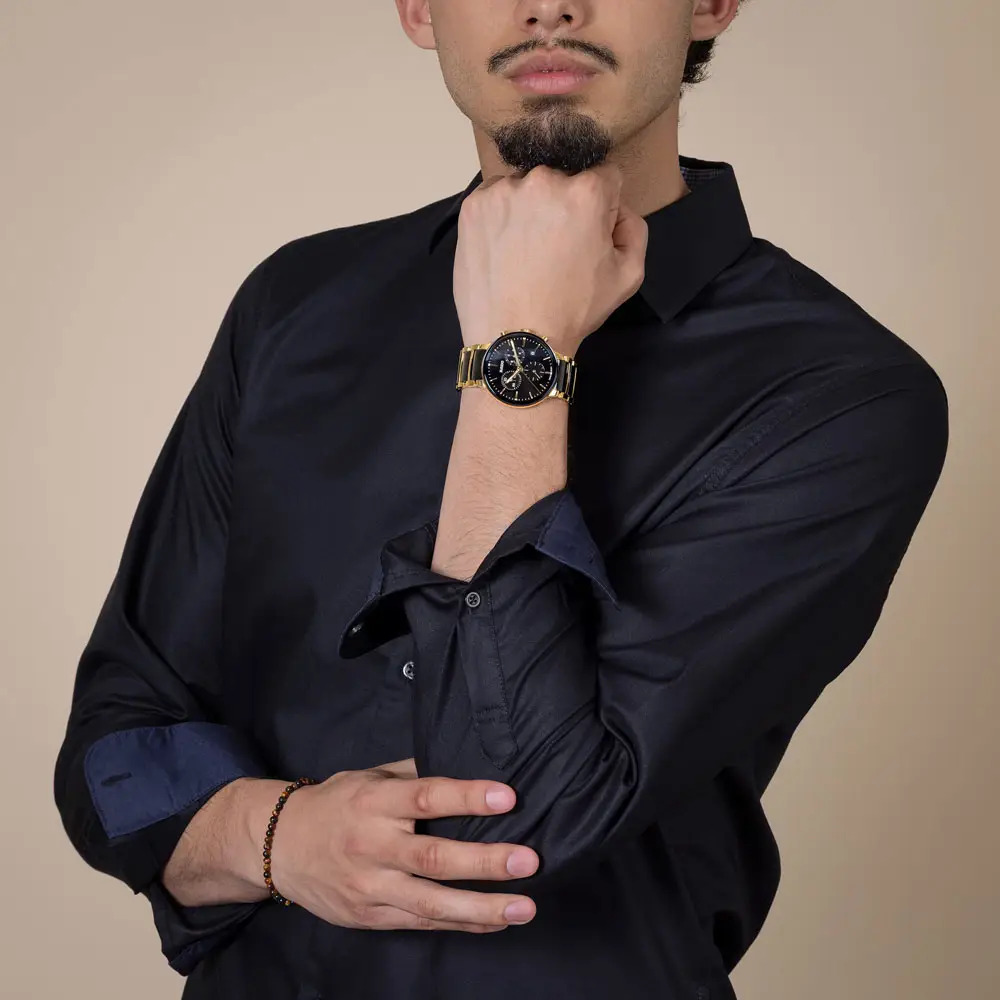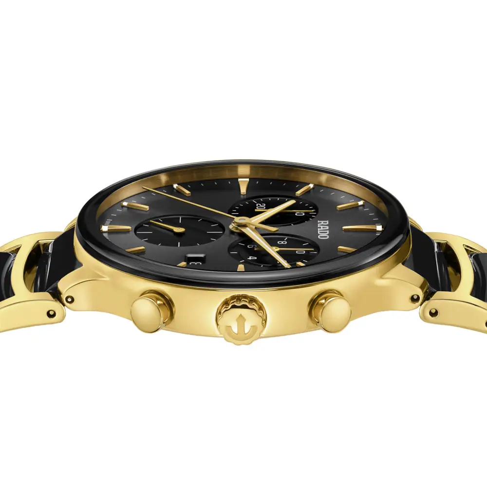 The Rado Centrix Chronograph combines sporty functionality with elegant design. The 41 mm diameter stainless steel case with gold-tone PVD finish is complemented by a gently curved sapphire crystal with an anti-reflective coating that protects the watch from scratches. The black sunray dial with golden indices and sub-dials offers a modern look as well as great legibility. Water resistance to 50 meters ensures sufficient protection for everyday wear.