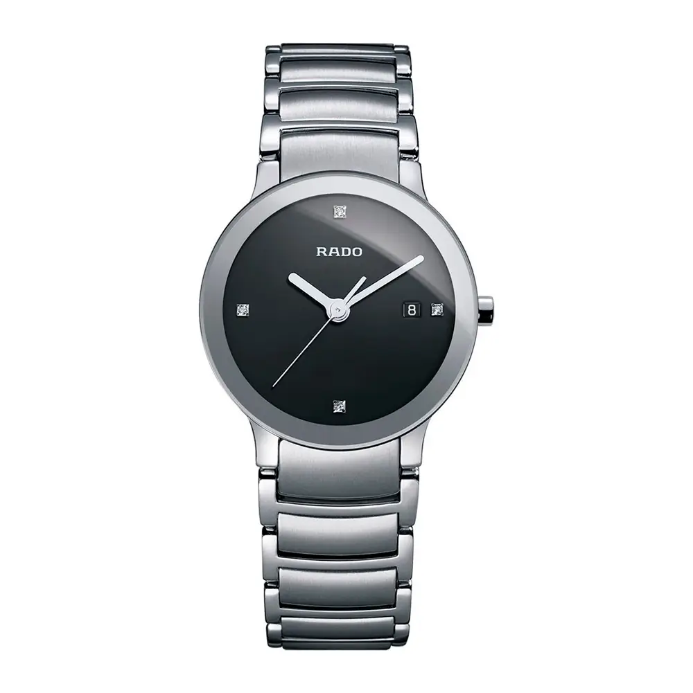 The Rado Centrix Diamonds R30928713 is an elegant ladies' timepiece that combines timeless style with subtle luxury. Its round stainless steel case measuring 28 mm is discreet and ideal for both everyday wear and special occasions. The sapphire crystal ensures high scratch resistance and a clear view of the black dial, which is accented with delicate diamond hour markers.