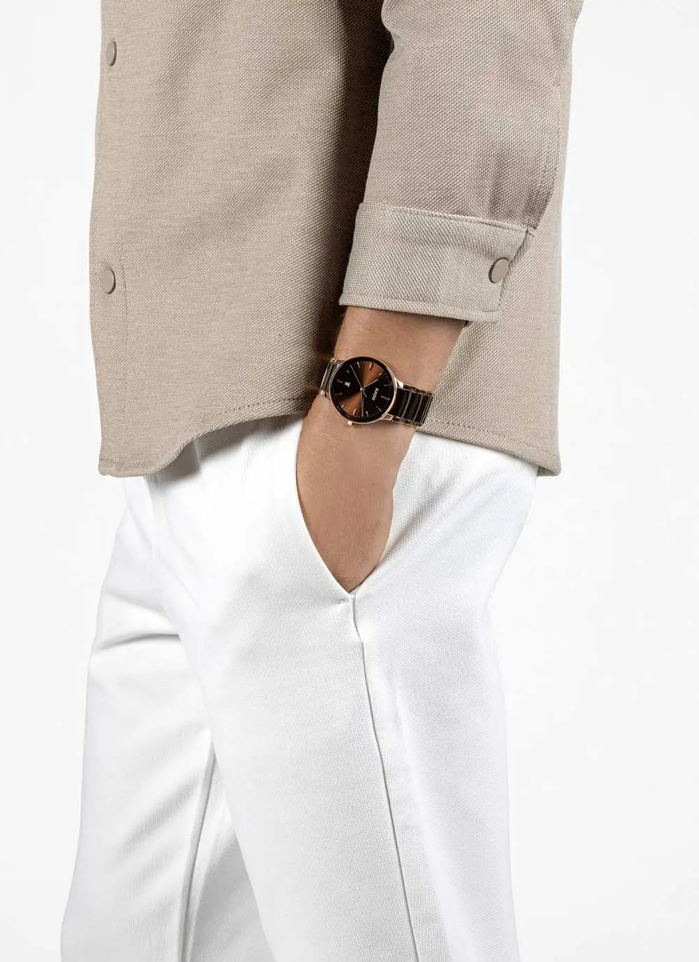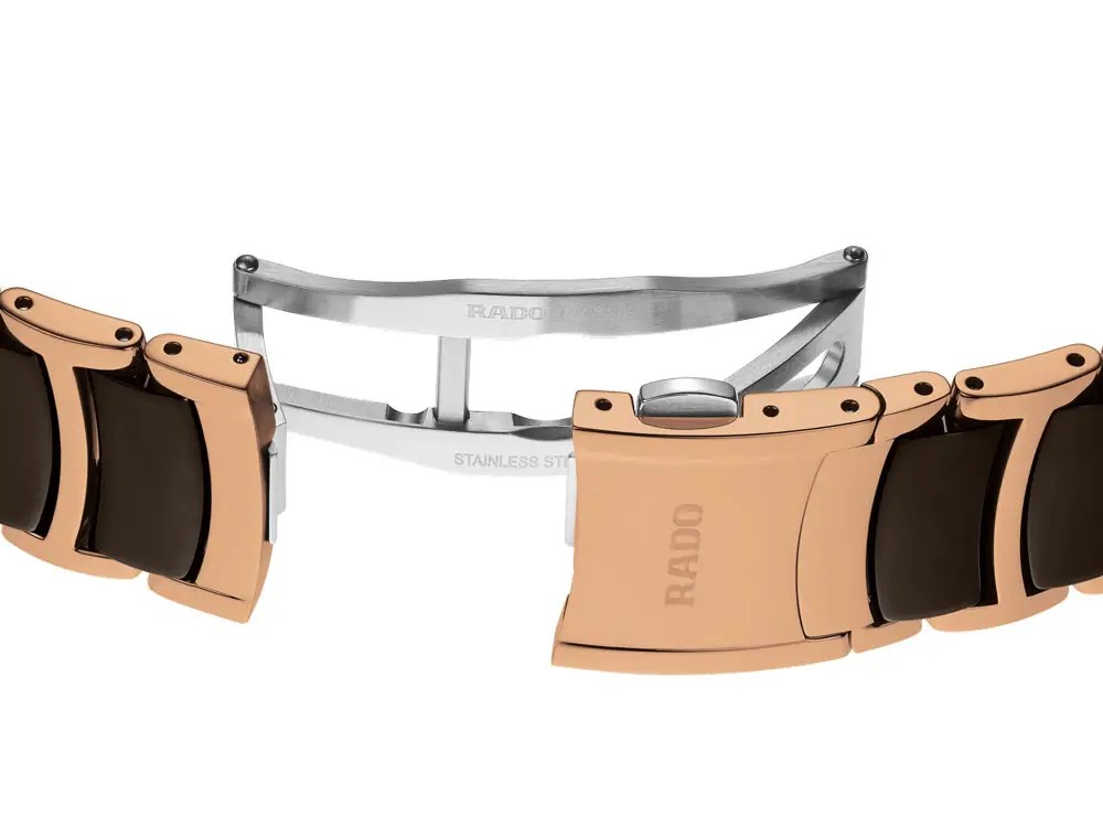 The luxurious Rado Centrix Quartz R30023302 combines timeless elegance with technical excellence. The 39.5 mm round stainless steel case with rose PVD coating gives the watch a bold, modern look. Smooth transitions between the ceramic bezel and the brown dial with a subtle sunburst effect enhance its aesthetic depth. The dial features a date window at 3 o’clock and is protected by sapphire crystal for scratch resistance.