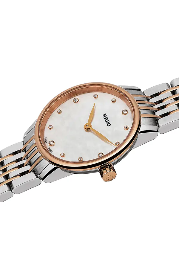 The Coupole Classic Diamond R ladies' watch by Rado impresses especially with its bicolour steel and rose gold finish. The pearly white dial, on which the numerals are replaced by precious diamonds, should not be overlooked. The size of the case is 27 mm. The watch is water resistant to 50 m.