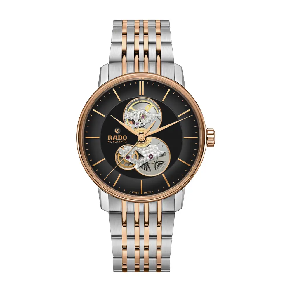 The two-tone bracelet in stainless steel and rose-gold PVD perfectly complements the overall design and ensures maximum wearing comfort. The Rado Coupole Classic Open Heart R22894163 stands as a symbol of timeless sophistication and Swiss excellence — ideal for men who value both tradition and innovation.