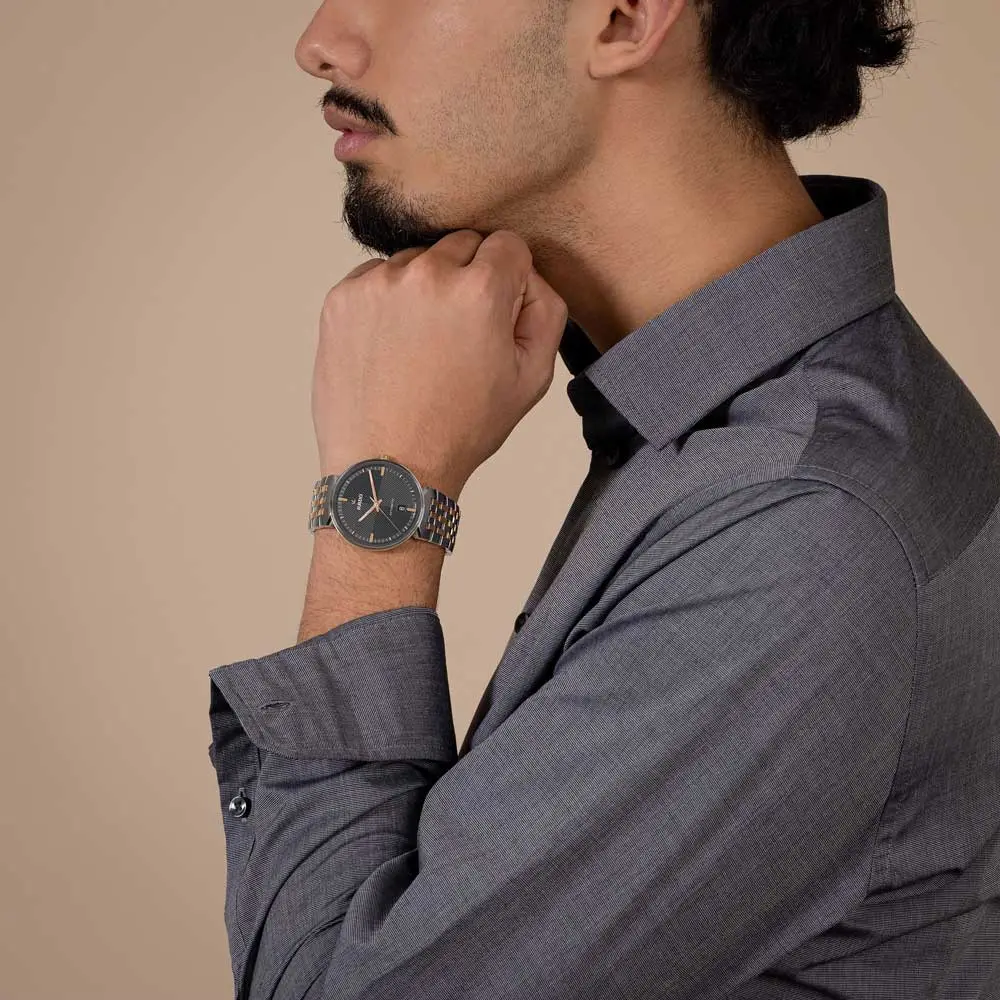 The grey analog dial is simple, legible, and elegant – perfectly matching the two-tone stainless steel bracelet, which is secured with a folding clasp for comfortable and safe wear.