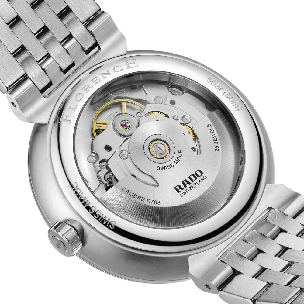 The Rado Florence Automatic R48903153 represents a harmonious fusion of classic aesthetics and modern watchmaking precision. The 39 mm round case is crafted from high-quality stainless steel, ensuring both durability and an elegant appearance.