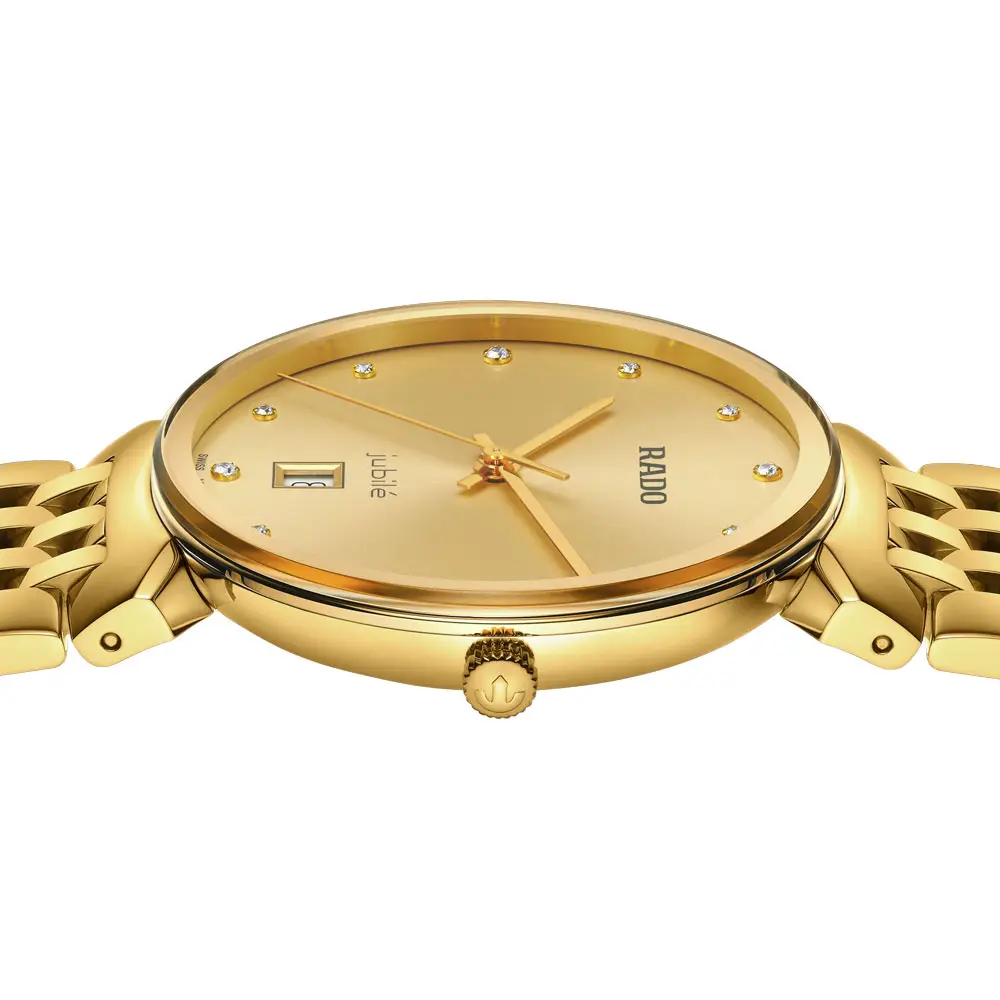 The Rado Florence Diamonds R48914713 combines Swiss precision, timeless design and luxurious details. The 38 mm stainless steel case with gold PVD coating is complemented by a curved edge-to-edge sapphire crystal, creating a clean and elegant look. The sunray dial is set with 12 diamonds, adding a refined and feminine touch.