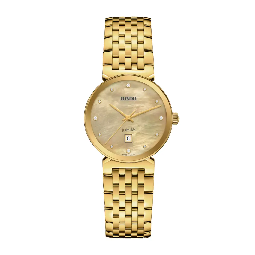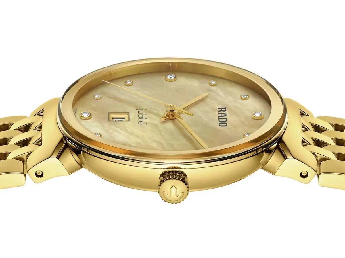 The Rado Florence Diamonds R48915903 embodies elegance, femininity, and Swiss precision in perfect harmony. Its 30 mm stainless-steel case with yellow PVD coating is seamlessly integrated with a matching steel bracelet, creating a refined and balanced silhouette. The mother-of-pearl dial adorned with 12 diamonds adds a touch of brilliance and sophistication, while the faceted sapphire crystal ensures both clarity and scratch resistance.