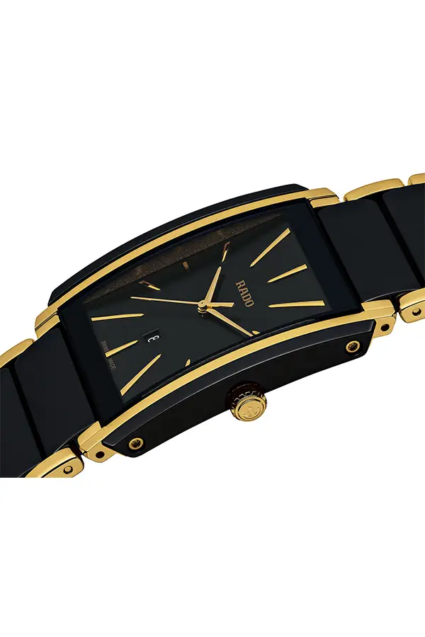 The Integral R20204162 is an iconic model that blends modern minimalism with luxurious details. The rectangular case measuring 31 × 41 mm, crafted from a combination of ceramic, stainless steel, and yellow gold plating, is protected by a durable sapphire crystal that ensures lasting brilliance without scratches. The elegant black dial is complemented by a practical date display at 3 o’clock, enhancing the model’s functionality.