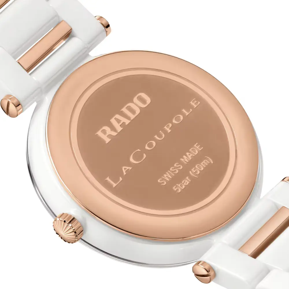 The Rado La Coupole Diamonds R22240703 women’s watch captures the essence of refined elegance and Swiss craftsmanship. Its design blends contemporary materials with timeless sophistication — a 31mm white high-tech ceramic case paired with a rose-gold PVD stainless steel bezel, offering a warm and graceful aesthetic.