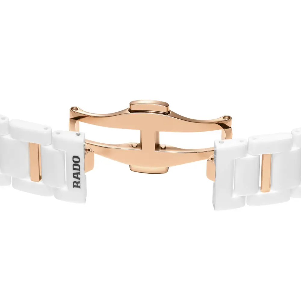 The silver dial features twelve brilliant-cut diamond hour markers, each sparkling under the scratch-resistant sapphire crystal. The harmony between white ceramic and rose-gold tones gives the watch a distinctly feminine and luxurious appeal, while the minimalist hands reflect Rado’s signature style.