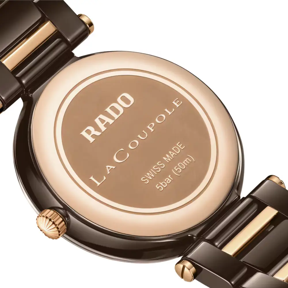 The Rado La Coupole Diamonds R22242703 women’s watch combines Swiss precision, technical innovation, and refined luxury. Its 31 mm polished brown high-tech ceramic case is paired with a rose-gold PVD stainless steel bezel, creating a warm and elegant contrast that embodies feminine sophistication.