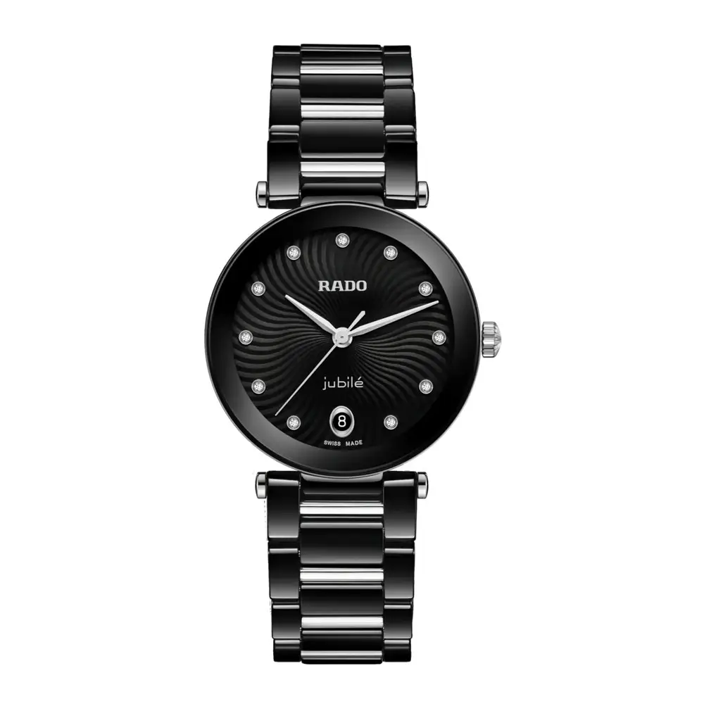 Rado LaCoupole Diamonds R22243703 embodies elegant luxury and timeless design. The 31 mm case is made of glossy black high-tech ceramic and complemented by a distinctive domed sapphire crystal with anti-reflective treatment. The black dial with wavy relief is decorated with 11 Top Wesselton diamond indexes, which give the watch a subtle and sophisticated shine. Water resistance to 50 m makes it ideal for everyday wear.