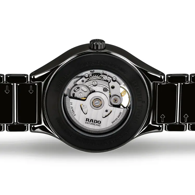 The integrated ceramic-titanium bracelet seamlessly matches the case, ensuring a comfortable fit and cohesive look. A transparent case back reveals the rotor in motion. The Rado True Round Secret R27107152 embodies the harmony of Swiss innovation, timeless elegance, and technical excellence – ideal for those who appreciate refined modernity.