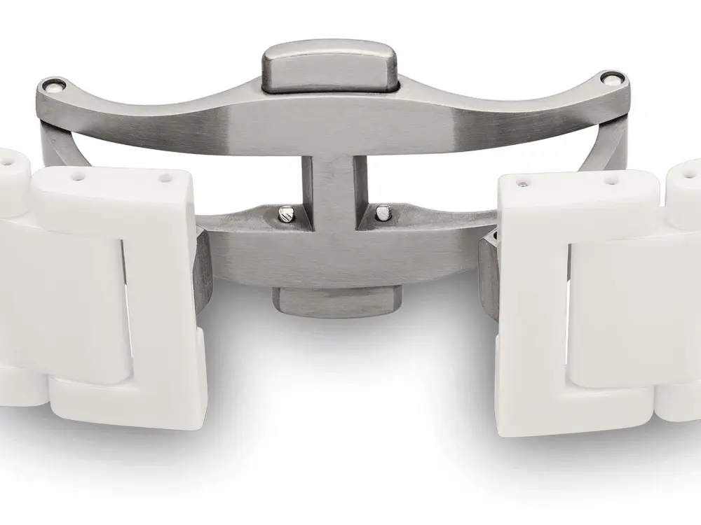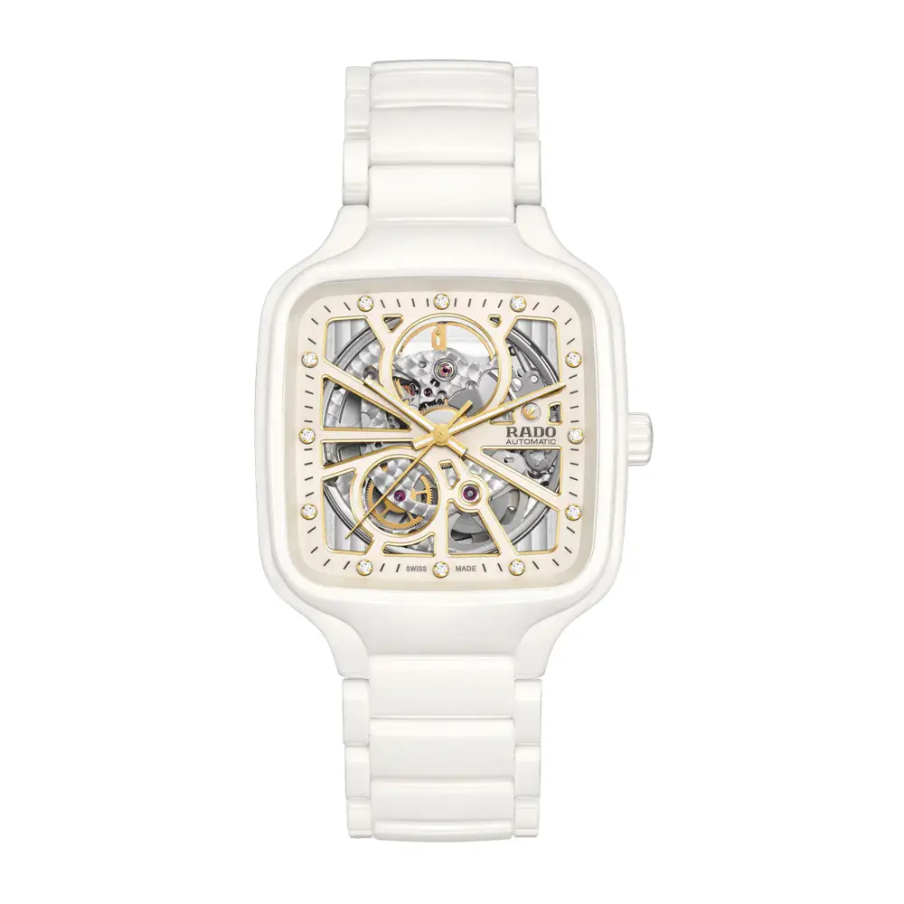 The Rado True Square Automatic Open Heart with a 38 mm square ceramic case embodies a modern fusion of luxury and innovative design. The minimalist ceramic case is complemented by a white ceramic bracelet with a folding clasp, offering lightness, durability, and comfort.