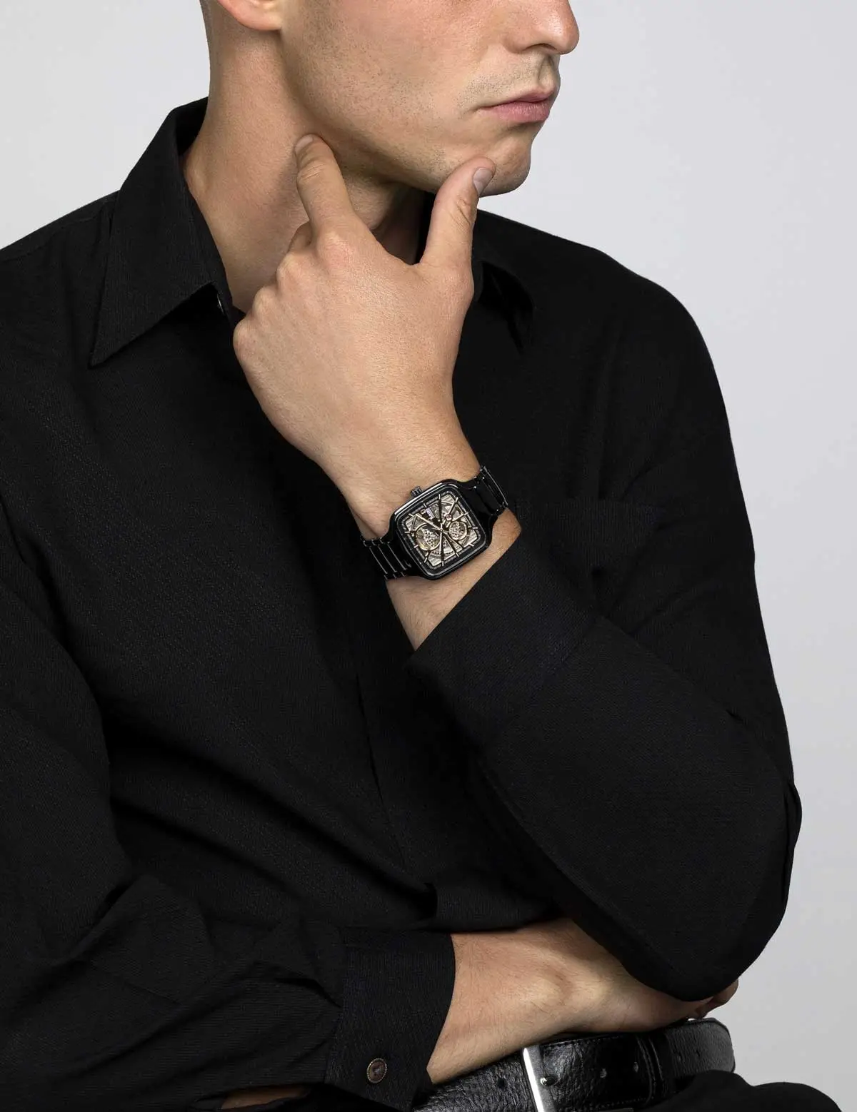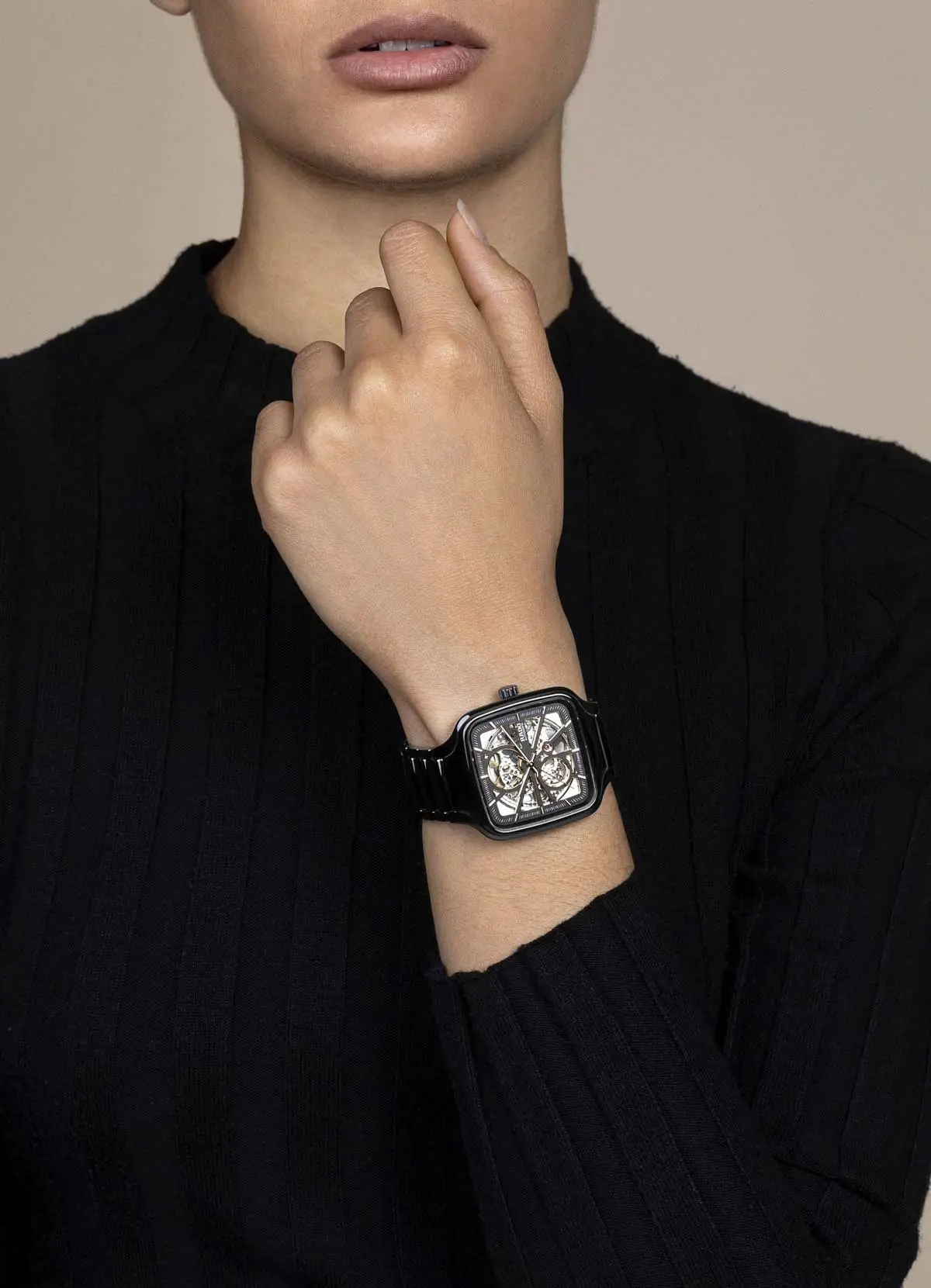 The Rado True Square Automatic Open Heart R27086162 redefines the brand’s iconic square design with a contemporary touch. Its 38 mm high-tech ceramic case is lightweight, hypoallergenic, and highly resistant to scratches. The elegant black skeleton dial with an open-heart aperture reveals the beating mechanism within, while the sapphire crystal ensures long-lasting clarity and protection.