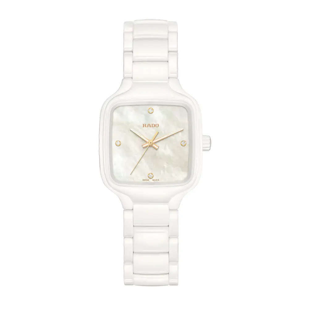 The Rado True Square Diamonds R27072902 perfectly embodies modern elegance and feminine sophistication. Its distinctive 29 mm square case crafted from white high-tech ceramic shines with a luxurious gloss, offering both lightness and exceptional scratch resistance. The mother-of-pearl dial is adorned with twelve diamond hour markers, adding a refined sparkle and timeless charm.