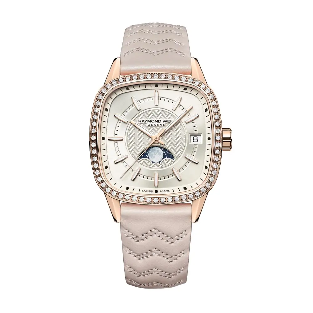 Raymond Weil Freelancer Ladies Moon Phase stands out with its elegant design and poetic details. The 34 × 34 mm case has a gently rounded shape and is made of stainless steel with a pink PVD finish. The cream mother-of-pearl dial is decorated with a "W" motif, a NASA-inspired moon phase, applied indices and rose gold hands. The convex glass-box sapphire crystal enhances the retro-modern character of the model.