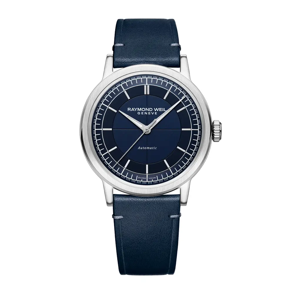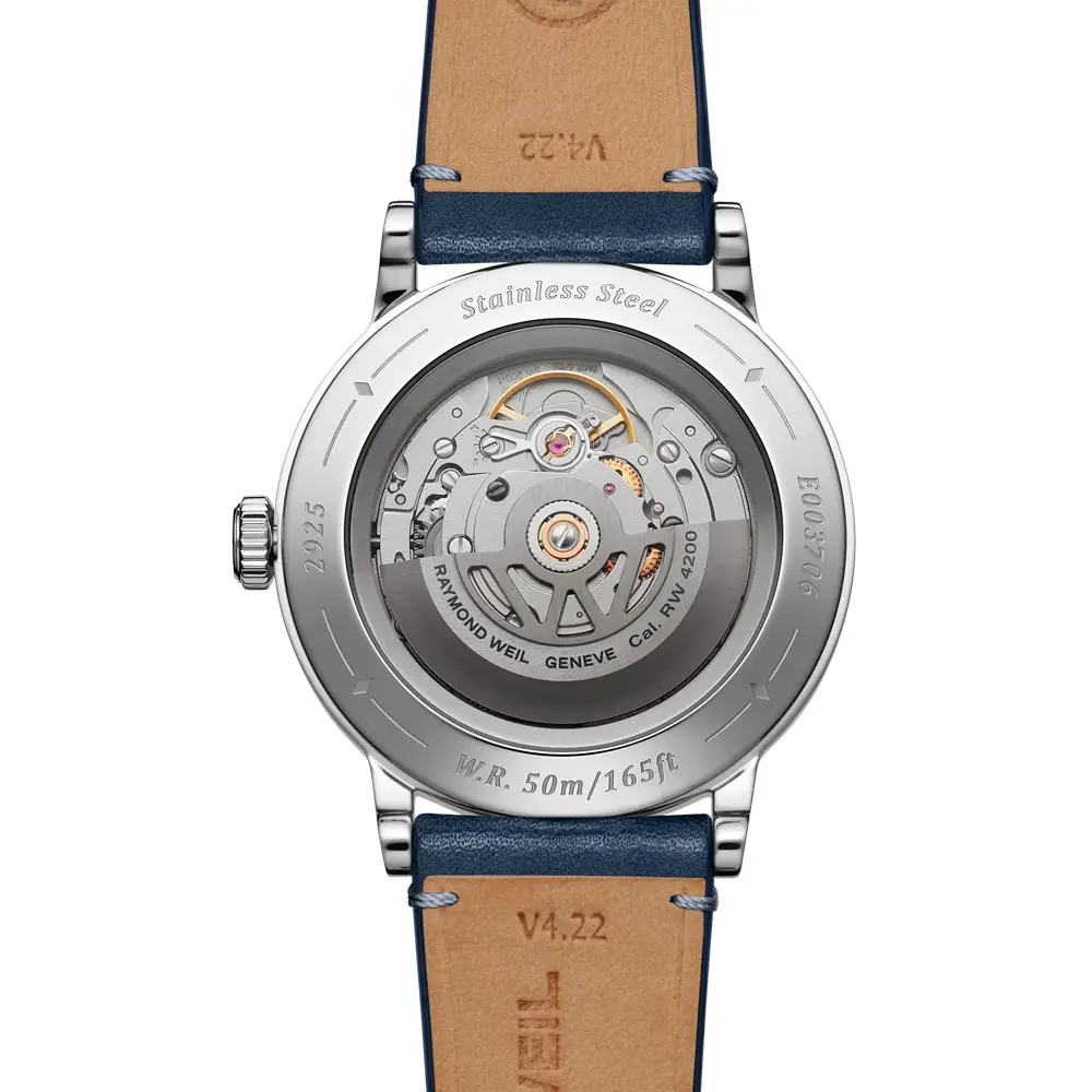 At its core beats the automatic calibre RW4200 with a 41-hour power reserve, visible through the transparent sapphire caseback. Completing the design is a blue leather strap with contrast stitching and 50-meter water resistance. The Raymond Weil Millesime 2925-STC-50001 is the perfect choice for men who appreciate timeless design, mechanical craftsmanship, and heritage-inspired style.