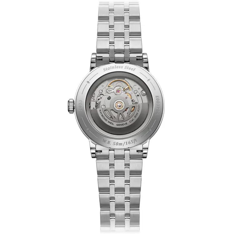 Inside beats the automatic calibre RW4251, offering a 41-hour power reserve and delivering smooth, precise performance. Through the transparent sapphire caseback, the decorated rotor with the Raymond Weil emblem reveals the brand’s dedication to craftsmanship. With water resistance up to 50 meters, this model is ideal for both daily wear and formal occasions.