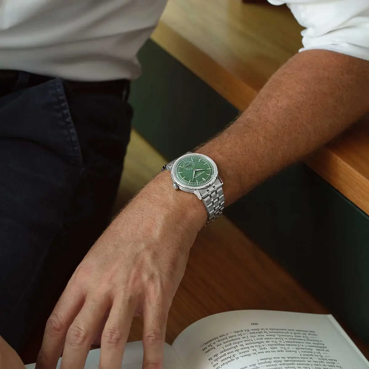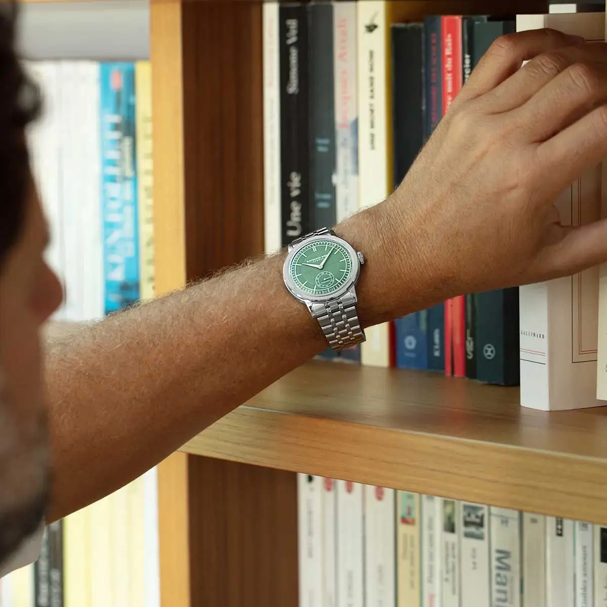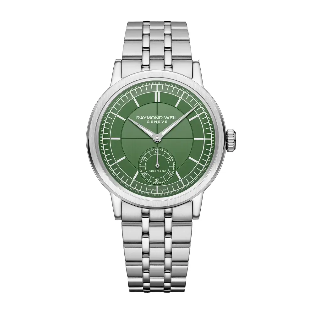The Raymond Weil Millesime 2930-ST-52001 embodies a refined balance of vintage aesthetics and modern elegance. Its 39.5 mm stainless steel case is topped with a domed sapphire crystal with anti-reflective coating, creating the signature “glassbox” effect. The green sector dial features subtle surface textures and a small seconds subdial at 6 o’clock, adding depth and harmony to the design.
