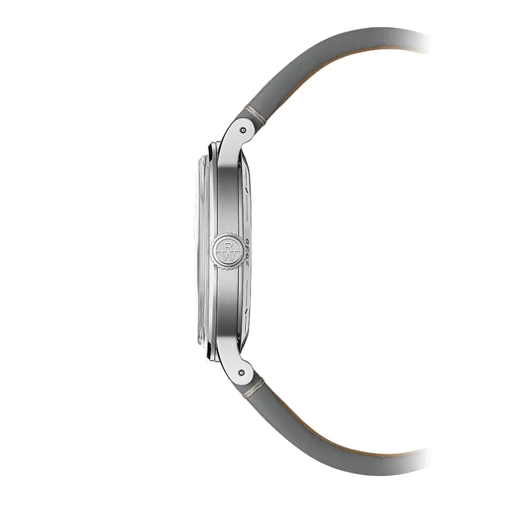 Inside ticks the automatic Swiss movement RW4251 with a power reserve of 38–41 hours. A transparent sapphire caseback reveals the intricately decorated mechanism and the signature W-shaped rotor. The grey calf leather strap with fine stitching and a classic steel pin buckle ensures comfort and timeless style.