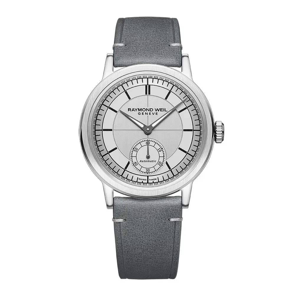 Raymond Weil Millesime 2930‑STC‑65001 is a refined union of vintage aesthetics and precise Swiss watchmaking. Its 39.5 mm stainless steel case features a domed sapphire crystal with anti-reflective coating, protecting a silver sector dial with subtle brushed textures and a small seconds subdial at 6 o'clock. The interplay of matte and polished surfaces adds elegant contrast and visual clarity.
