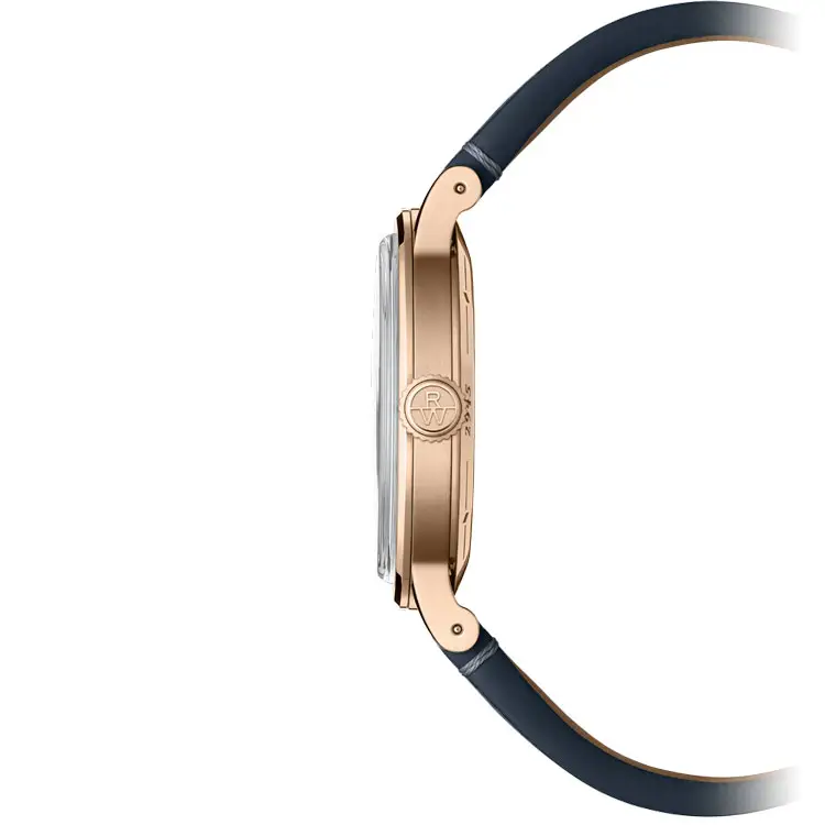 The Raymond Weil Millesime 2945-PC5-50001 embodies classic elegance, mechanical precision, and the poetry of the moon phase. Its 39.5 mm stainless steel case with rose gold PVD coating is paired with a domed sapphire crystal with anti-reflective treatment, creating the signature “glassbox” effect. The midnight blue sector dial features refined textures and a moon phase aperture at 6 o’clock, giving the watch a uniquely sophisticated character.