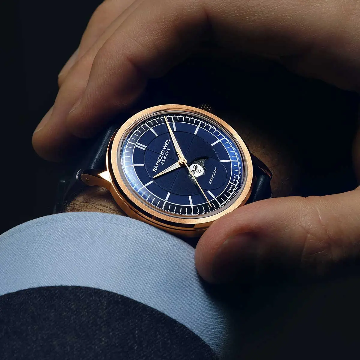 The model is completed with a blue calf leather strap featuring W-shaped stitching and a rose PVD-coated buckle. The Raymond Weil Millesime 2945-PC5-50001 is an ideal choice for gentlemen seeking a balance of sophistication, Swiss tradition, and the charm of a moon phase complication.