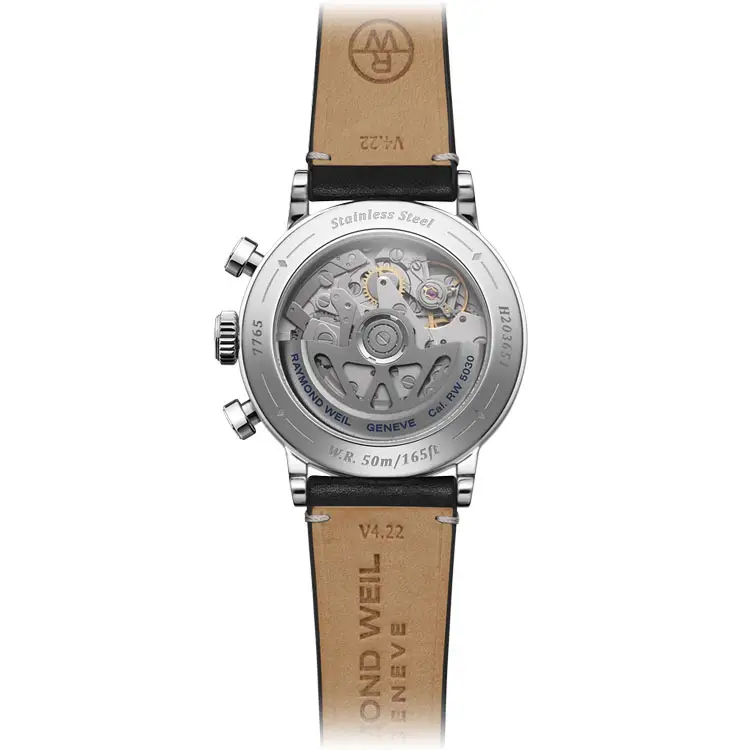 At its heart beats the automatic calibre RW5030, operating at 28,800 vibrations per hour and offering a 56-hour power reserve. The transparent caseback reveals the decorated rotor and fine finishing, showcasing Raymond Weil’s dedication to detail. The tri-compax chronograph layout enhances both the sporty and refined character of the watch.