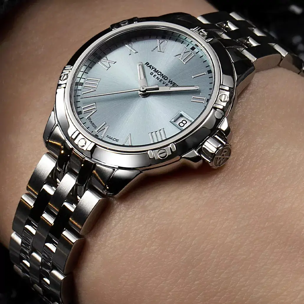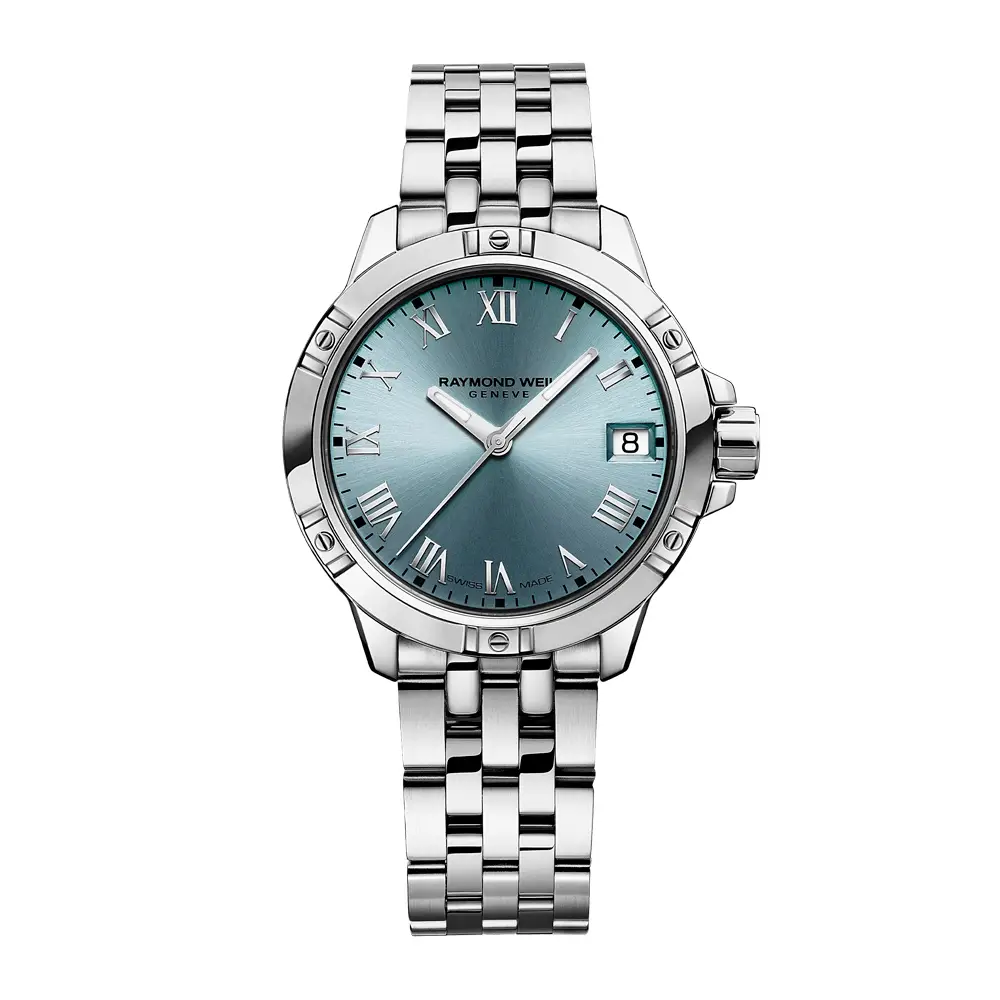 The Raymond Weil Tango 5960-ST-00500 perfectly combines elegance, functionality, and Swiss precision. The 30 mm stainless steel case is fitted with a scratch-resistant sapphire crystal, while the light blue sunray dial features Roman numerals, luminous hands, and a date window at 3 o’clock, adding both practicality and charm.