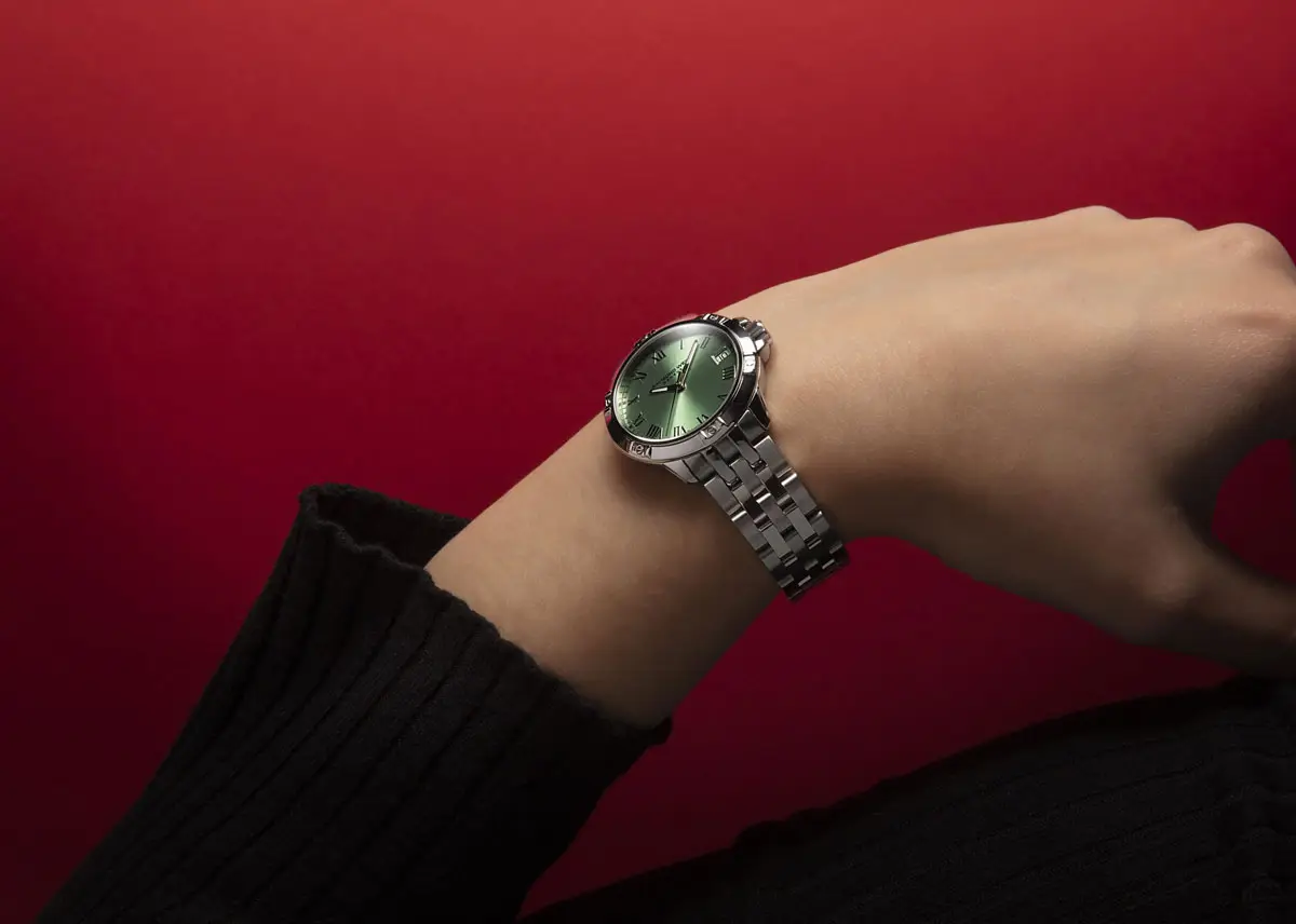 The Raymond Weil Tango 5960-ST-00520 combines elegant design, refined details, and Swiss precision. The 30 mm stainless steel case is protected by a scratch-resistant sapphire crystal, while the light green sunray dial features Roman numerals, luminous hands, and a date window at 3 o’clock, blending practicality with timeless elegance.