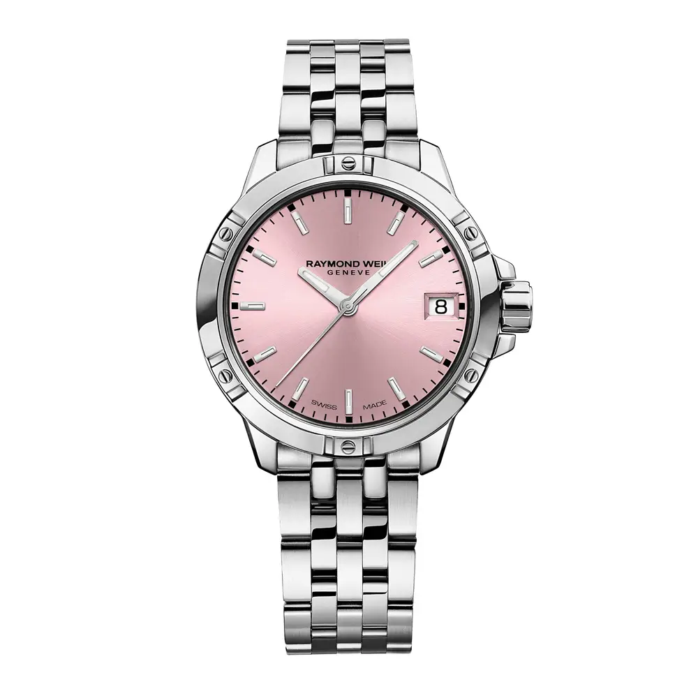 The Raymond Weil Tango 5960-ST-80001 embodies Swiss elegance, femininity, and functional design. Its 30 mm stainless steel case is complemented by the collection’s signature bezel with decorative screws. With its slim profile and balanced proportions, this model is ideal for both everyday wear and formal occasions.