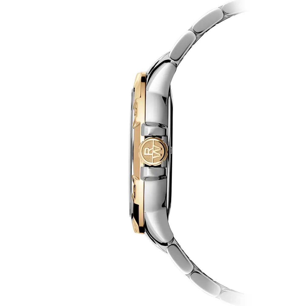 The Raymond Weil Tango 8160-STP-00308 combines classic two-tone design, Swiss precision, and timeless elegance. Its 41 mm stainless steel case with yellow gold PVD accents is protected by a scratch-resistant sapphire crystal. The white dial features gold Roman numerals, hands, and a date window at 3 o’clock, creating a harmonious and refined look.