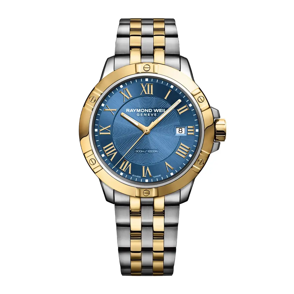 The Raymond Weil Tango Two-Tone 8160-STP-00508 embodies classic elegance, modern design, and Swiss precision. Its 41 mm stainless steel case is enhanced by a yellow gold PVD finish, emphasizing the refined two-tone aesthetic. The deep blue dial with Roman numerals and a date window at 3 o’clock creates a sophisticated contrast with the gold details, offering a timeless and distinguished appearance.