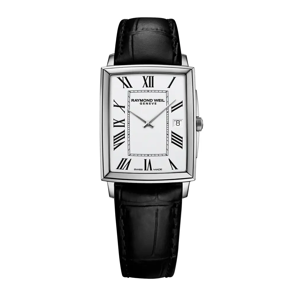 The Raymond Weil Toccata 5425-STC-00300 combines a classic rectangular shape, minimalist elegance, and Swiss precision. The 37.25 × 29.60 mm stainless steel case is fitted with a scratch-resistant sapphire crystal, protecting a white dial adorned with black Roman numerals and a date window at 3 o’clock.