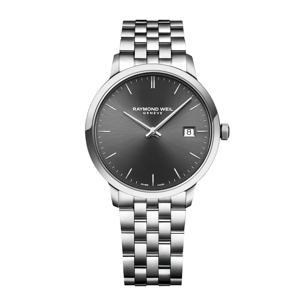 The Raymond Weil Toccata 5588-ST-60001 embodies classic elegance, modern minimalism, and Swiss precision. Its 42 mm polished stainless steel case is protected by a scratch-resistant sapphire crystal, framing a sunray grey dial with silver-tone hands and indexes. A date window at 3 o’clock adds functionality while maintaining the watch’s clean and balanced aesthetic.