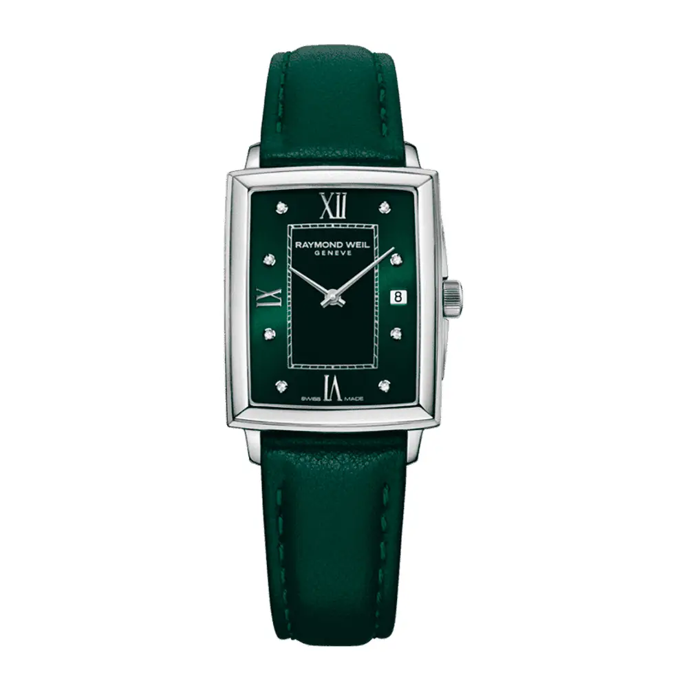 The Raymond Weil Toccata 5925-STC-00521 ladies' watch is an elegant embodiment of classic Swiss watchmaking that combines delicacy, precision, and sophisticated design. This model from the Toccata collection stands out with its unique rectangular stainless steel case, measuring 22.6 × 28.1 mm. The elegant lines of the case are complemented by a green analog dial adorned with subtle diamond markers and a practical date window.