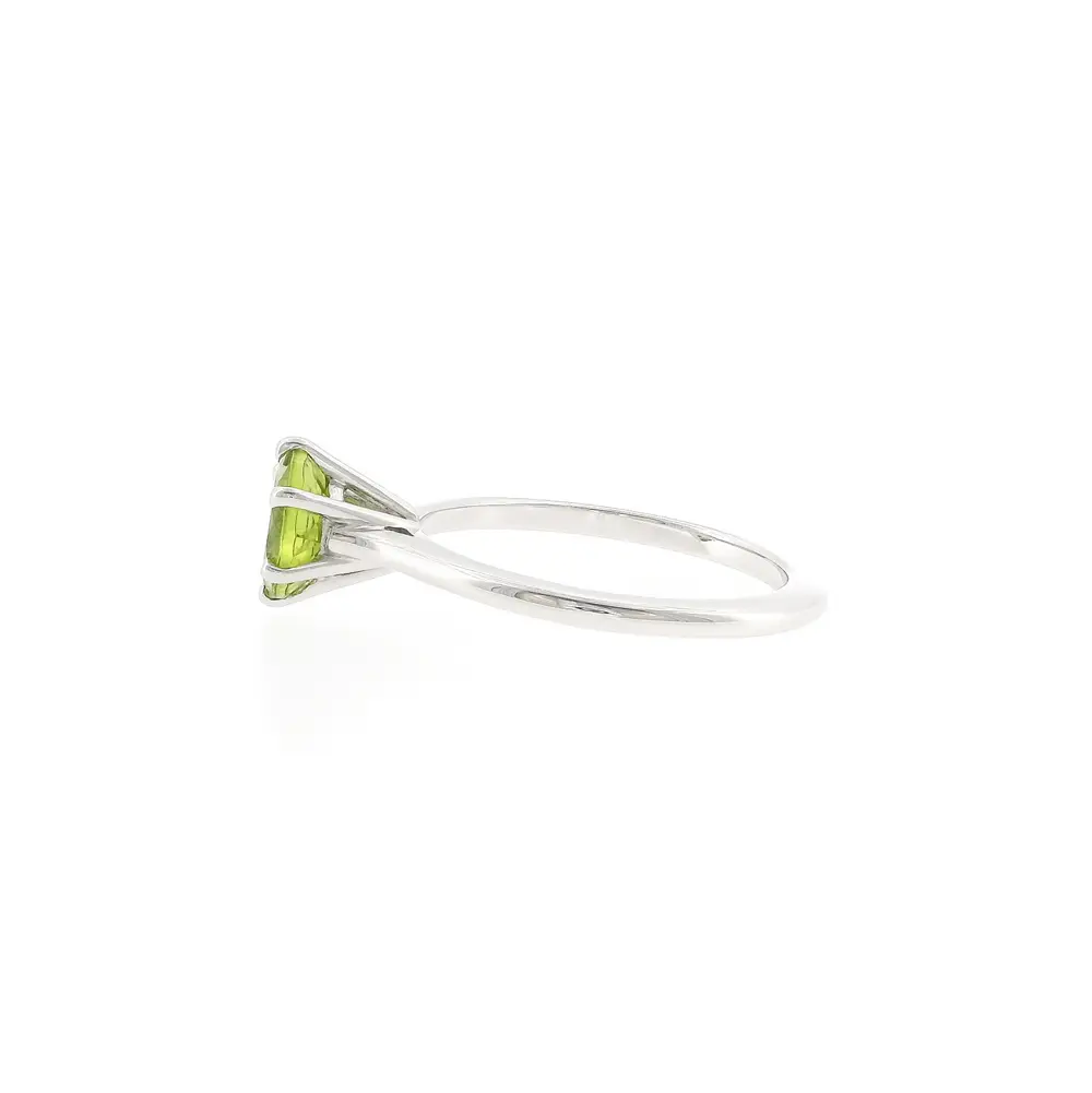 The 18k white gold ring with a 1.40 ct peridot is an elegant piece of jewelry with a clean and timeless design that highlights the beauty of the central gemstone. The ring features a natural peridot weighing 1.40 ct, whose fresh green color gives the jewel a distinctive and vibrant character. The minimalist solitaire setting allows the gemstone to stand out and emphasizes its natural brilliance.