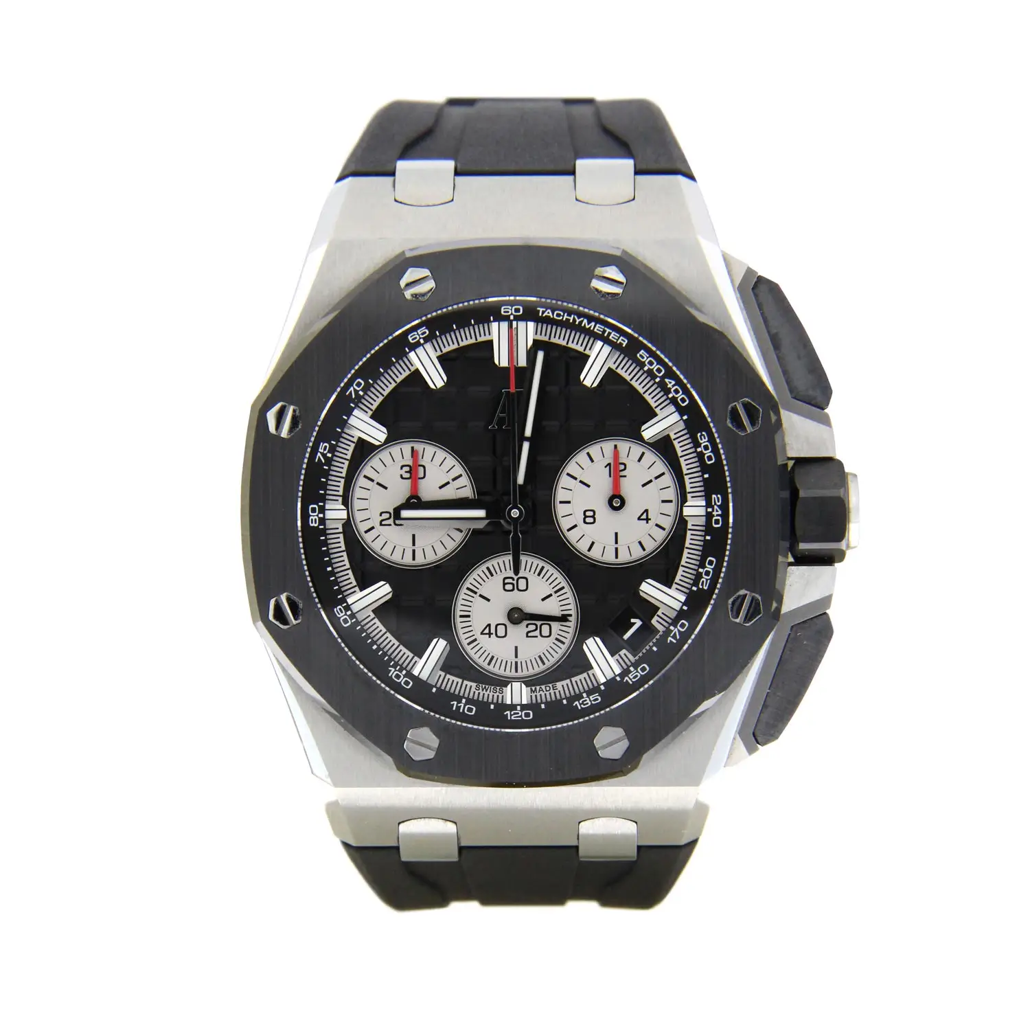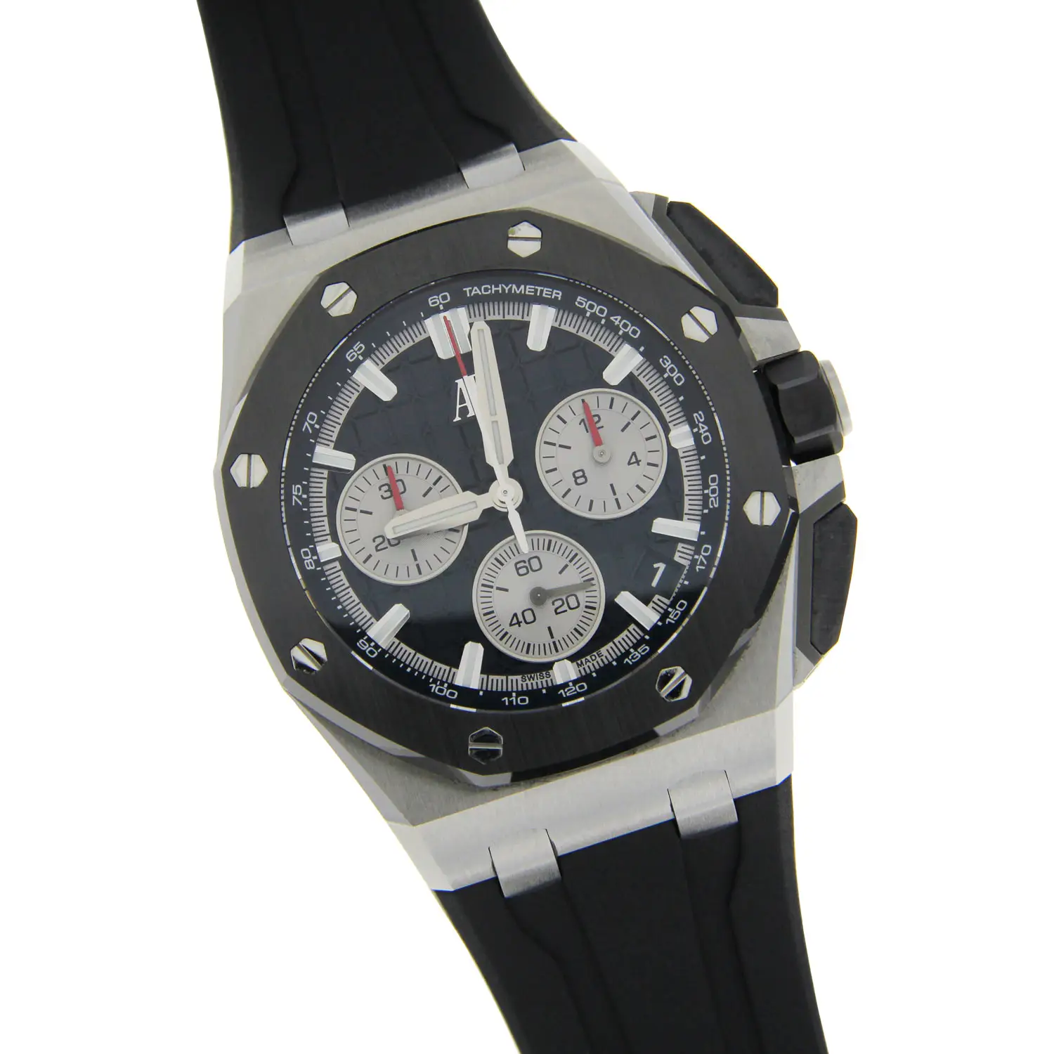 Inside works the in-house automatic calibre 4401 with integrated chronograph, flyback function, column wheel and 72-hour power reserve. A transparent sapphire crystal case reveals the finely decorated movement and demonstrates the exceptional watchmaking standards of the Audemars Piguet manufacture.